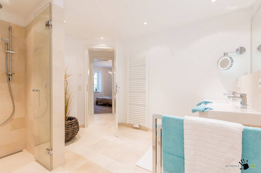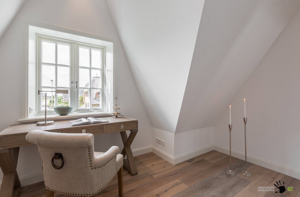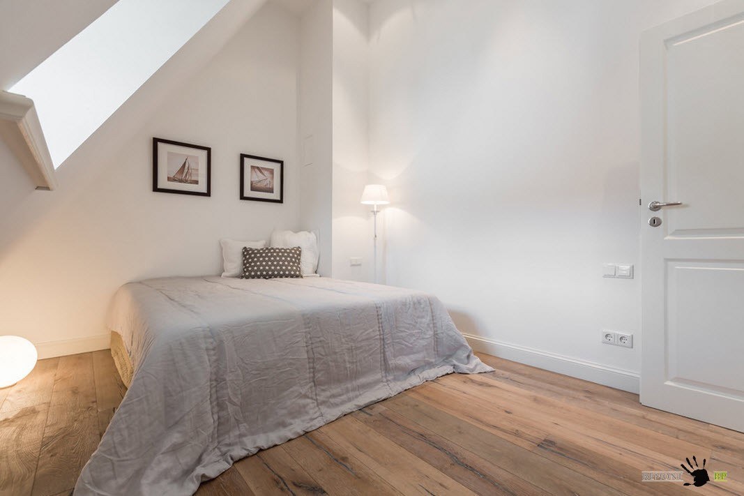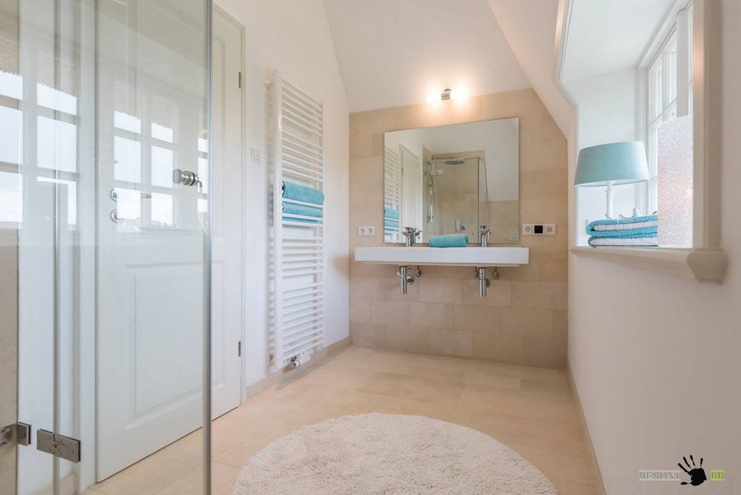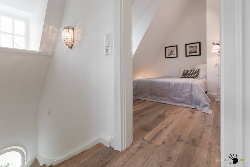 На втором этаже частного дома в Германии находятся личные комнаты – спальни и прилегающие к ним ванные комнаты. Для мансардных помещений с асимметричными комнатами и большим скосом потолков белоснежная отделка – наиболее удачный вариант оформления. Белый цвет не только скрадывает особенности архитектуры, позволяет сохранить ощущение простора, но и привносит эффект чистоты и легкости в интерьер.