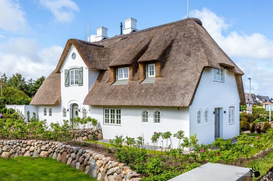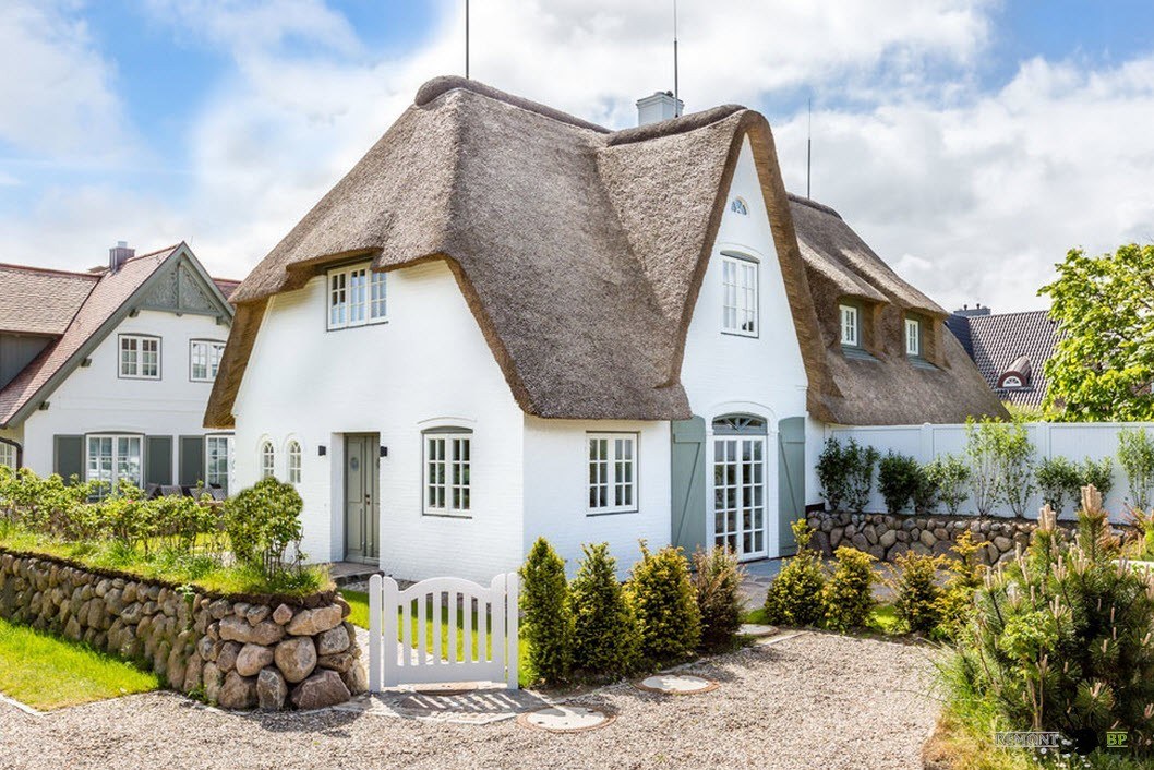Ассоциации с загадочным домиком из сказки возникают у многих, кто видит фасад этого немецкого дома впервые. Необычный дизайн крыши и оригинальный выбор покрытия выступает в качестве фокусного центра, притягивающего все взгляды, эффектно выделяющего все строение среди собратьев по улице. Белоснежная покраска кирпичных стен служит нейтральным фоном для оригинального покрытия крыши, создавая праздничный, эффектный контраст не только по цвету, но и по фактуре.
