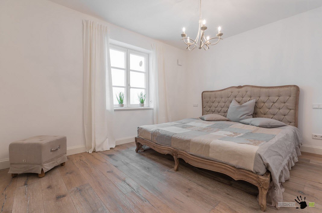 Во второй спальне мы видим все тот же простор, свет и минималистскую обстановку. Большой кровати с резными ножками и мягким изголовьем в пастельных тонах ничто не мешает быть не просто центром фокусировки внимания комнаты для сна и отдыха, но и быть самым темным пятном в этой белоснежной комнате. Небольшой пуф и изящная люстра завершают скромный, но при этом элегантный дизайн спальни.