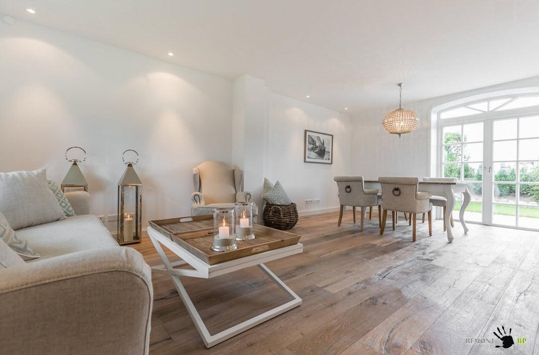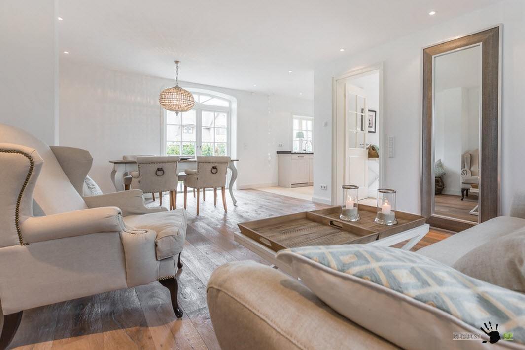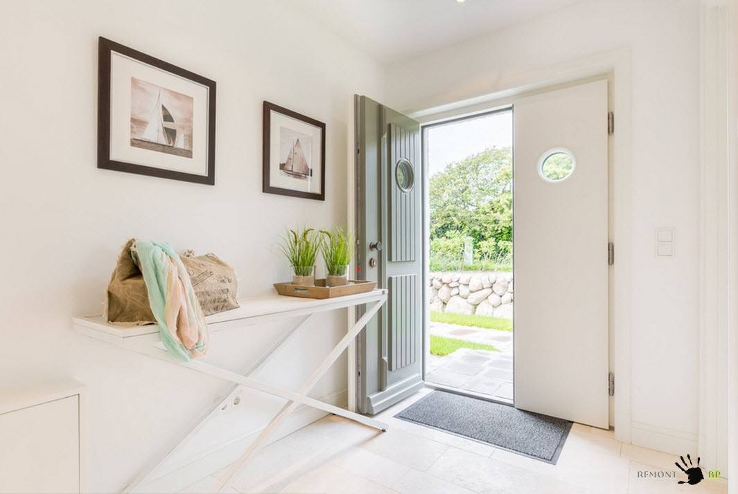 Легкие вкрапления морской стилистики в светлый и свежий образ загородного дома ощущается уже на входе в жилище. Белоснежная отделка пространства, светлая меблировка, круглые окна-иллюминаторы на входе, морские пейзажи в настенном декоре – все в обстановке прихожей, как визитной карточке здания, работает на создание легкого и светлого образа немецкого загородного жилья.