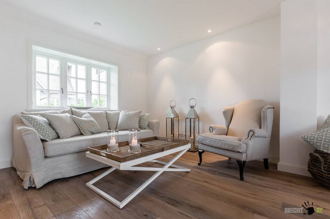 Мягкий удобный диван и кресло с льняной обивкой в нейтральных тонах составили зону отдыха гостиной. Невысокий столик оригинального дизайна стал эффектным функциональным дополнением к образу. Фирменное исполнение ножек столика с перекрестием в белоснежном исполнении смотрится контрастно на фоне древесной облицовки полов.