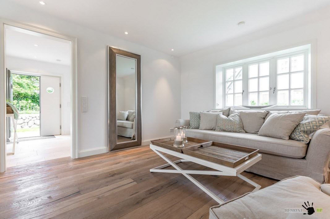 Неудивительно, что в самой большой и важной, с точки зрения функций, комнате частного домовладения, белоснежная отделка стала неотъемлемой частью оформления пространства. Лишь светлая древесина напольного покрытия и некоторых элементов интерьера, пастельные тона обивки мягкой мебели и зеркальные поверхности разбавляют белую палитру интерьера общей комнаты.