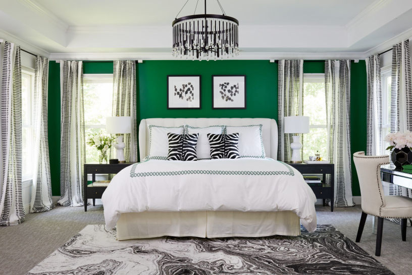 А вот темные вариации зеленого подходят спальням с выходом на солнечную сторону. Маленьким и ограниченным в естественном освещении комнатам лучше избегать использования темной палитры, а именно цветов: