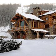 Альпийский домик на фоне живописных горных массивов – еще одна популярная разновидность деревянной постройки. Такое шале имеет более рациональную планировку. Чаще всего мы можем наблюдать роскошную просторную террасу и несколько милых балкончиков, искусно дополняющих внешний облик домов в швейцарском стиле. Крышу делают из громоздких бревен пологой, выходящей за границы строения, причем с минимальной обработкой поверхности. Подобное жилище – настоящее убежище от любой непогоды, а нарочитый экстерьер производит впечатление надежного защитника. Поэтому грубоватая фактура с сучками смотрится здесь весьма органично.