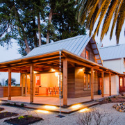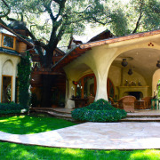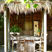 Альтернативным решением станут конструкции из пластика, декорированные планками с имитацией дерева. Крыша, изготовленная из шифера, черепицы или камыша, будет очень органично смотреться на общем фоне.