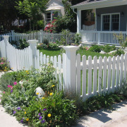 Немаловажное значение в дизайне экстерьера деревянных домов играет забор. Это первый элемент, который является основным показателем стиля и образа внешнего убранства дома. Необычные формы верхней части изгороди, оригинальное расположение деревянных досок, живописно расписанные ворота еще раз подчеркнут индивидуальность и безупречный вкус хозяев.