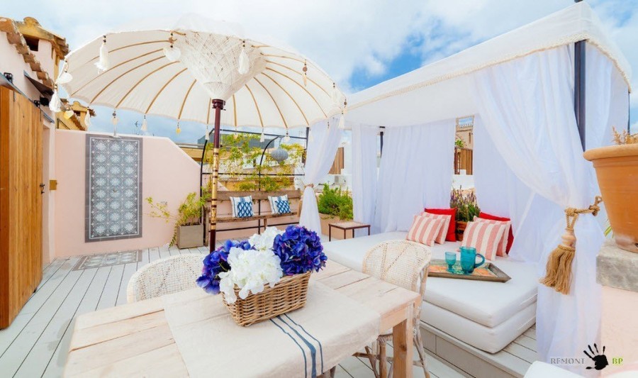 Белоснежное облачение мягкой зоны для отдыха может показаться непрактичным, но ткань легко снимается с металлического каркаса навеса и стирается, тоже самое касается текстильного чехла большого мягкого матраса. В испанском дизайне сложно обойтись без цвета страсти и победы – ярко-красный оттенок текстиля подушек «смягчен» присутствием этого же тона, но в более разбавленном представлении в виде тонких полосок.