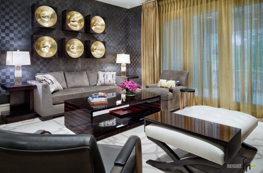 В качестве основного напольного покрытия гостиной использована паркетная доска. Центральная зона помещения устлана мягким паласом коричневатого оттенка с невысоким ворсом. Основное освещение комнаты производится при помощи огромной люстры, висящей в центре зала. В помещении есть также дополнительные источники света – небольшие светильники круглой формы, разместившиеся под балконами.