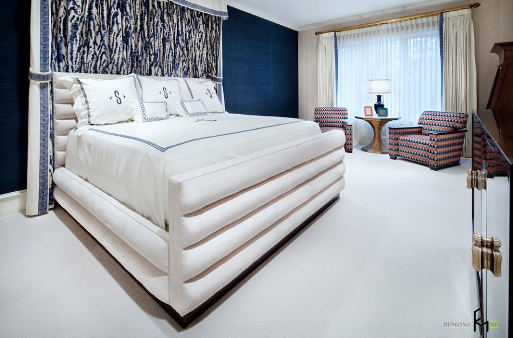 Несколько помещений в загородном особняке занято под спальни. Каждая из них оформлена по-своему. Спальные комнаты отличаются как по стилю, так и по цветовой гамме.