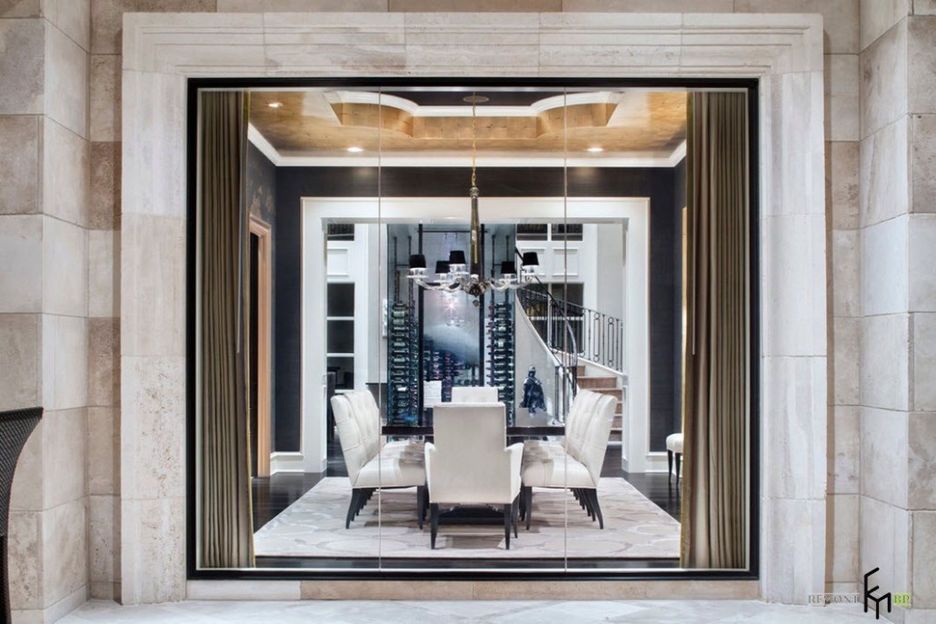 Эта небольшая зона, отгороженная от других помещений при помощи стекла и металла, привлекает внимание всех, кто становится посетителем усадьбы. Речь идет о месте, где хранятся благородные спиртные напитки. Вино различных видов размещается в специальных ячейках, откуда его несложно извлечь. Стеллажи, заполненные бутылями со спиртными напитками, придают залу неповторимость и дополнительный шик.