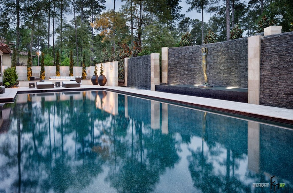 Благодаря прямоугольному бассейну, наполненному прозрачной водой, воздух во дворе дома приобретает особую свежесть и чистоту. К тому же территория особняка соседствует с зоной леса, что придает внутренней площадке загородной усадьбы неповторимый колорит.