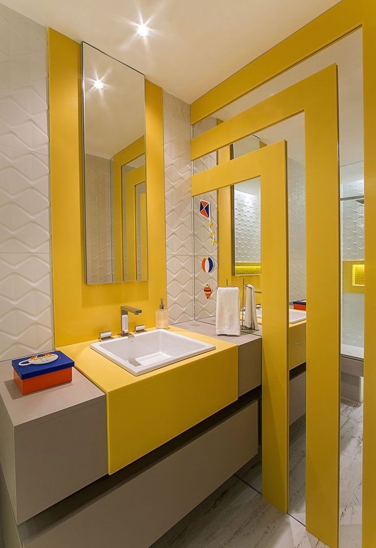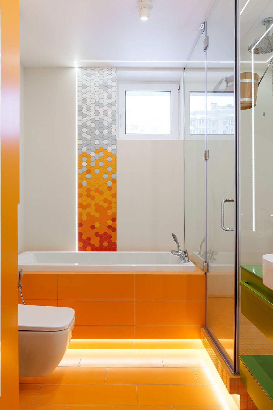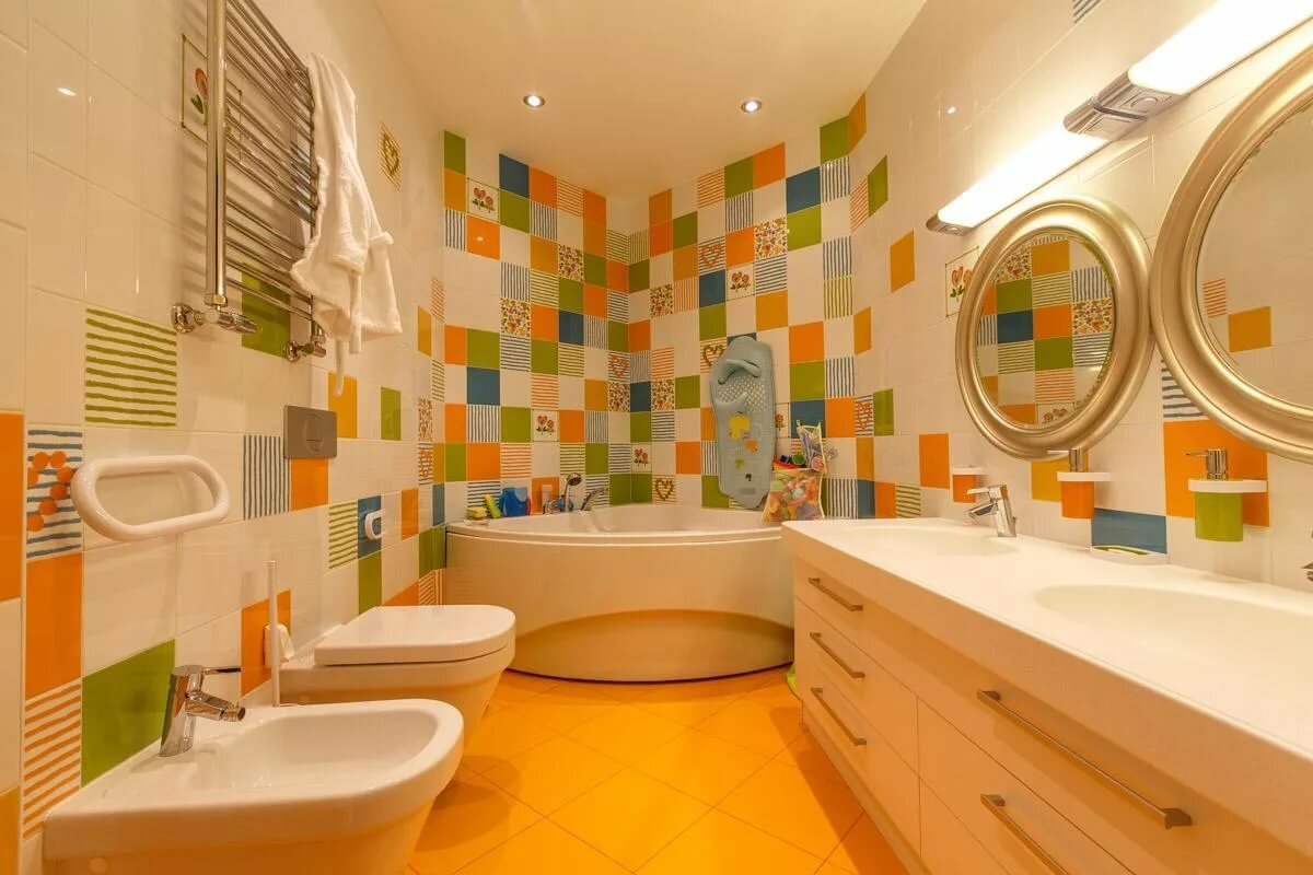 Остается решить, что именно в ванной комнате будет ярким? Самым частым решением для яркой палитры являются стены: цветные панели или кафель. Но не стоит «окрашивать» радужными красками абсолютно все поверхности. Достаточно оформить стены частично (цветные полосы или клетки) или если сплошным цветом, только одну поверхность.