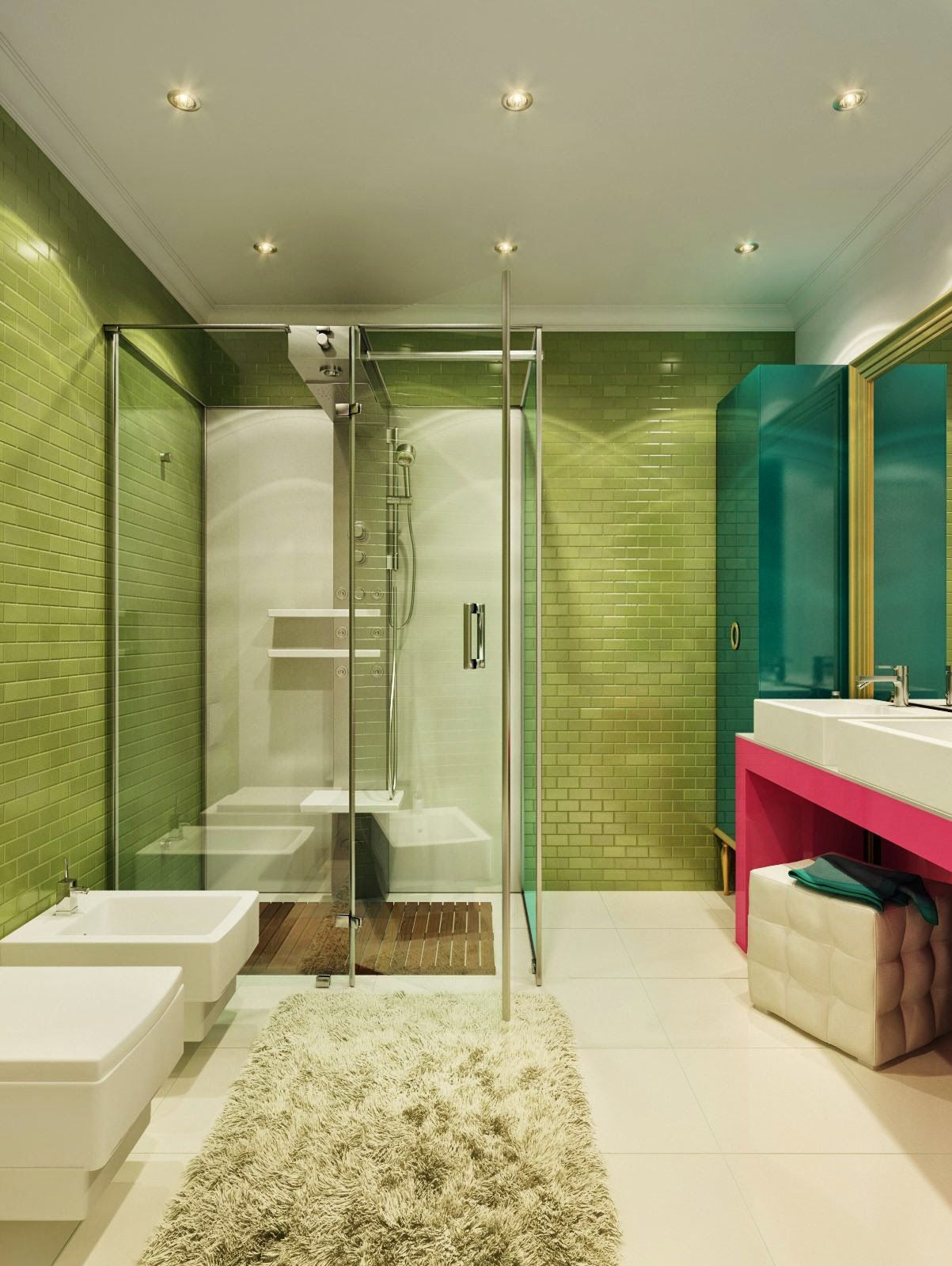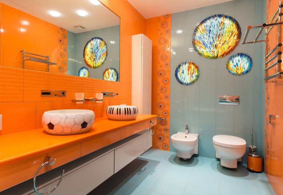 Людям, которым важно с утра хорошенько взбодриться, кому не хватает позитивных, жизнерадостных, динамичных моментов в течении дня, понравится яркий санузел. Красочную ванную обязательно оценят маленькие дети и приверженцы всего новомодного. Кроме того, яркие цвета в ванной комнате являются отличной альтернативой надоевшей светлой палитре. Остается выяснить, как именно использовать сочную гамму в комнате с санузлом.