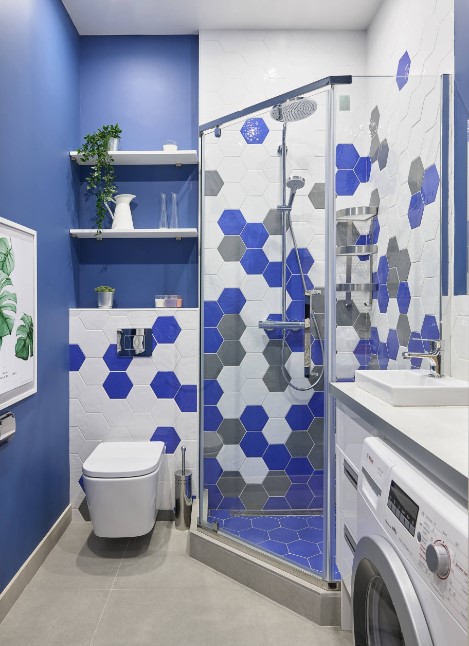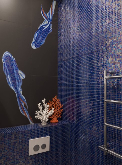 Вместо габаритной плитки лучше выбрать мелкую мозаику. Но главное не переборщить. Если, например, мозаичная отделка присутствует на всех стенах, то потеряются границы других деталей интерьера.