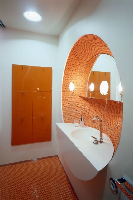 Даже в маленьком помещении возможно сделать яркие акценты. Единственной проблемой в создании неординарного интерьера – отсутствие естественного освещения. Ведь в современных квартирах санузлы не имеют окон. В закрытом помещении с ярким окрасом цвета могут перегружать интерьер и «резать» глаза. Но если использовать в них глянцевые поверхности, то помещение получиться визуально расширить и в таком случае яркая палитра уже не будет чрезмерной.