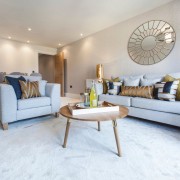 Необычная геометрия, с которой мы столкнулись в холле, продолжает свое главенство и в зоне гостиной. Оригинальное исполнение стоики из материала, имитирующего дерево, вполне достойно звания арт-объекта. Светло бежевые оттенки мебельной обивки и коврового покрытия создают приятную и уютную атмосферу в гостиной зоне, а необычный дизайн стоек, которые несут функционал журнальных столиков, привносит элемент неожиданности, оригинальности пространства.