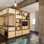 Если у вас есть маленькие дети, то подобные подставки креативного дизайна могут послужить причиной для травм, лучше отдать предпочтение более округлым формам. А вот насыщенный цвет уникальных предметов мебели и декора невероятно освежают атмосферу помещения. Из гостиной с ярким колоритом можно попасть в зону кухонного пространства, для этого достаточно подняться на невысокий пьедестал с подсветкой.