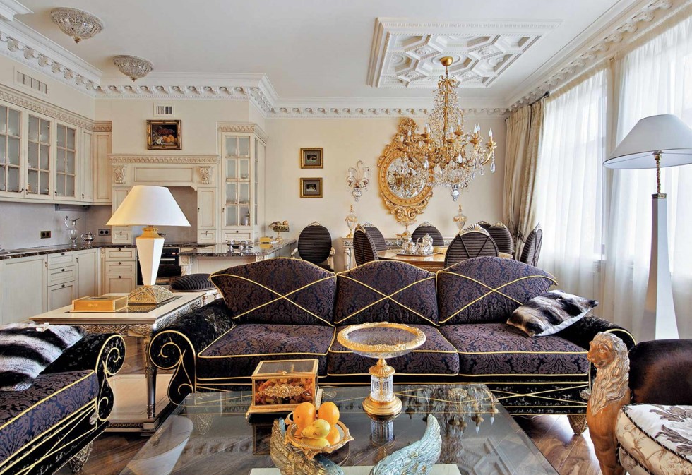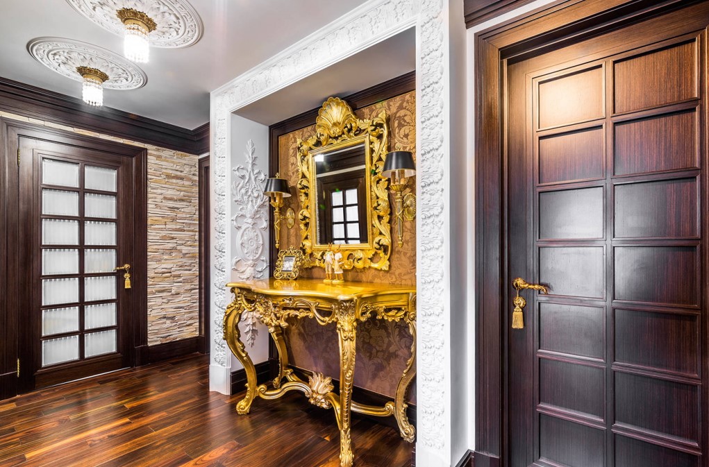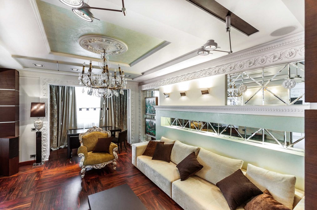 - Отделку для стиля лучше выбирать в зависимости от основного стиля. Если за основу взята классика, то, например, на потолок можно «добавить» лепнину. А если больше лофта, то вполне уместно добавить красивые потолочные балки.