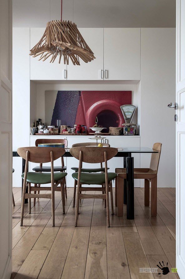 В кухонном пространстве мы вновь наблюдаем гармоничное сочетание современной обстановки с ретро-элементами и кантри-стилистикой – линейная система кухонного гарнитура с белоснежными фасадами шкафов, деревянные стулья и необычная люстра из аналогичного материала, старинные весы, кухонные аксессуары, собранные по блошиным рынкам и антикварным магазинам и ультрамодный обеденный стол.