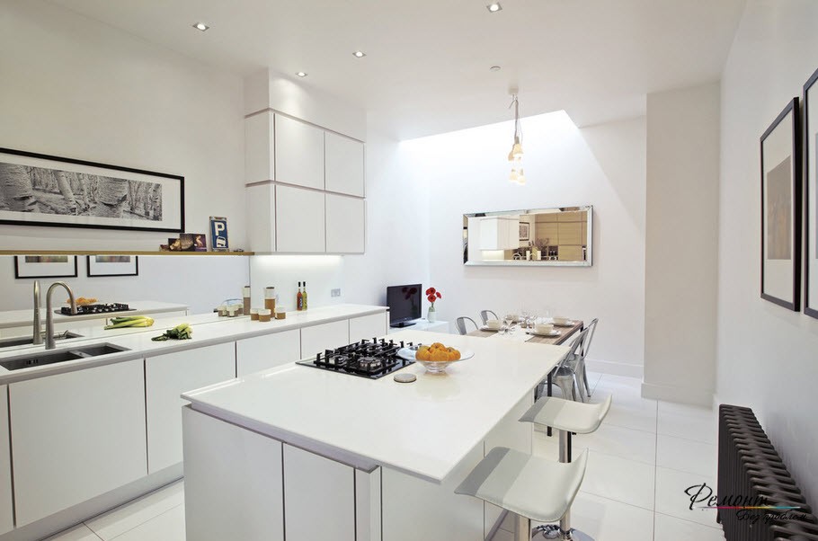 Оформление в таком духе придется по нраву аккуратисткам, поскольку порядок гарантируют глянцевые пустые поверхности, рациональная организация кухонной утвари, спрятанной за дверцами шкафов. Открытые полки исключаются в принципе. Островные или полуостровная комплектации мебели на большой площади сочетается с П-образной расстановкой предметов. Сдержанность в отделке и строгий дизайн комнаты удачно смотрится на фоне натяжных потолков или побеленной поверхности, с розеткой для люстры и лепниной по периметру.
