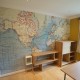 Фрагментарные заставки из фотообоев имеют успех. Реально оформить открытую стену листами с кулинарными рецептами или мерными пропорциями. Белые линии маркировки на серой плоскости уж точно не назовешь банальными.