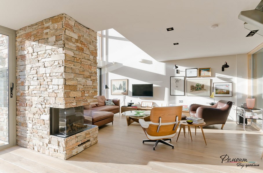 Камин можно расположить посередине комнаты, сделав его центральным предметом интерьера. Такой вариант подходит для просторных помещений и имеет свое преимущество: обзор камина доступен из любого места в комнате. Такой вид камина оборудуется специальными стеклянными стенками для обеспечения кругового обзора.