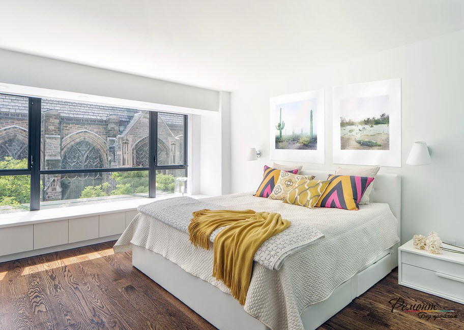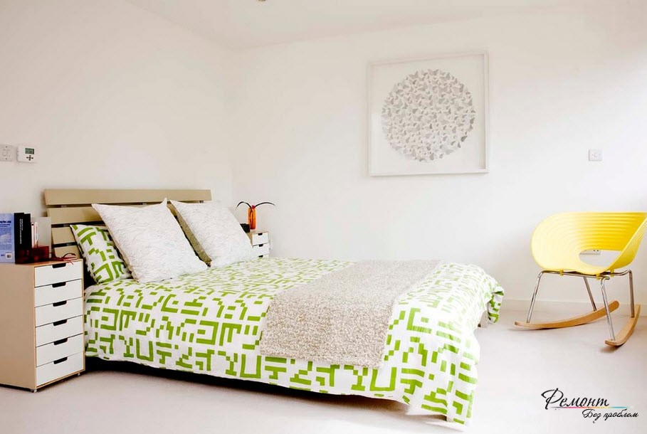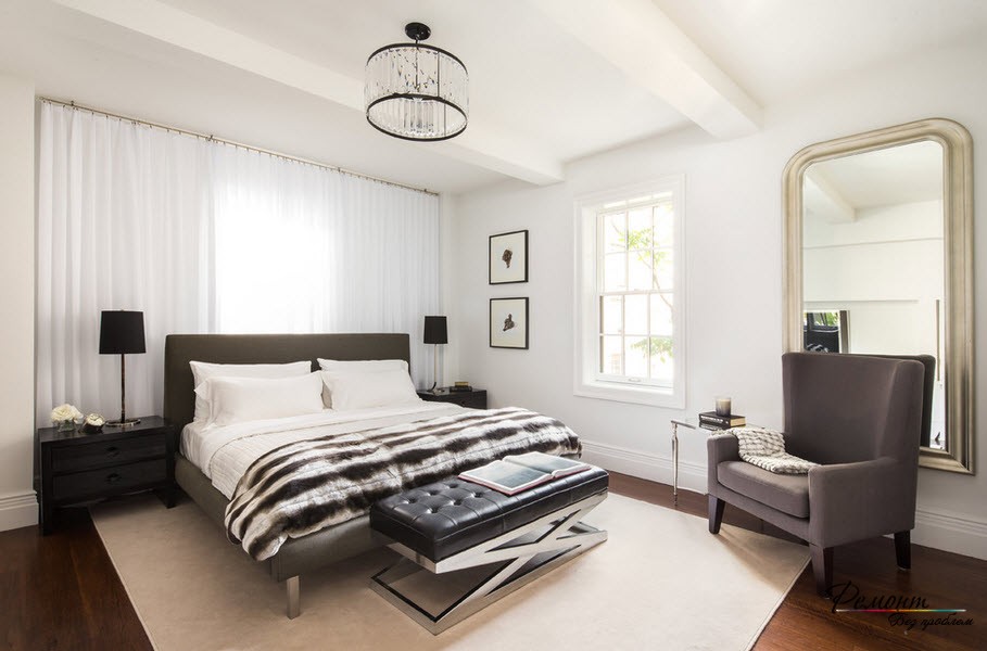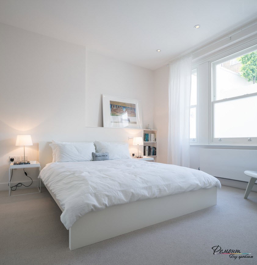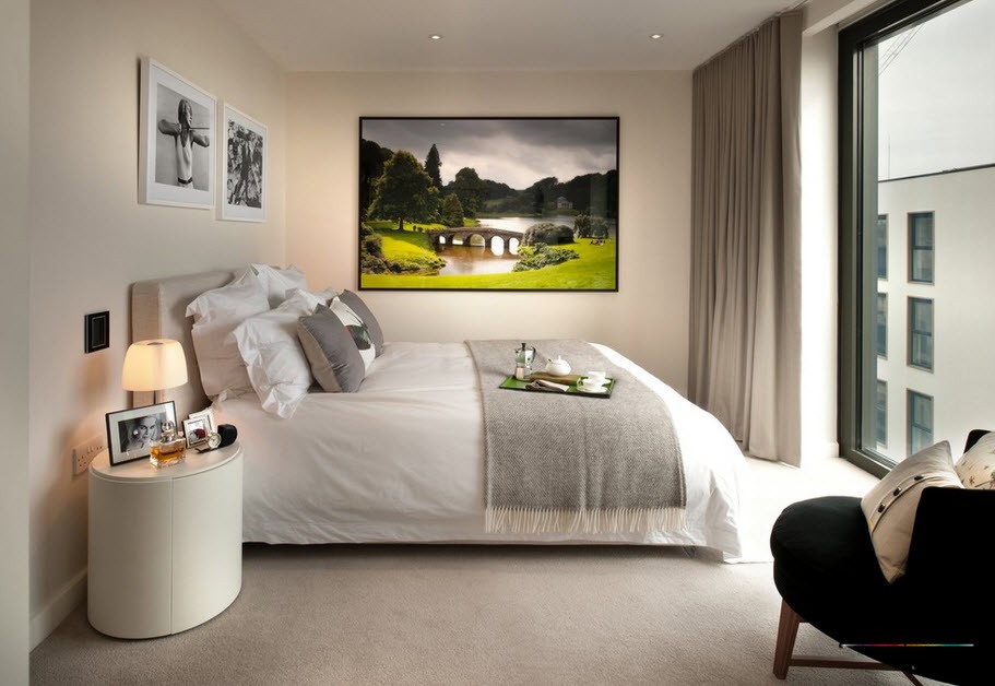 - белый: наполняет комнату свежестью и заряжает положительной энергией. Спальня в белых тонах создает впечатление чистоты и аристократизма. Но для того чтобы комната не выглядела как больничная палата, важно разбавлять белый цвет другими оттенками. Для формирования спокойной атмосферы нужно использовать светлые цвета: серый, бежевый. Для оживления атмосферы можно разбавлять белый яркими контрастными оттенками.