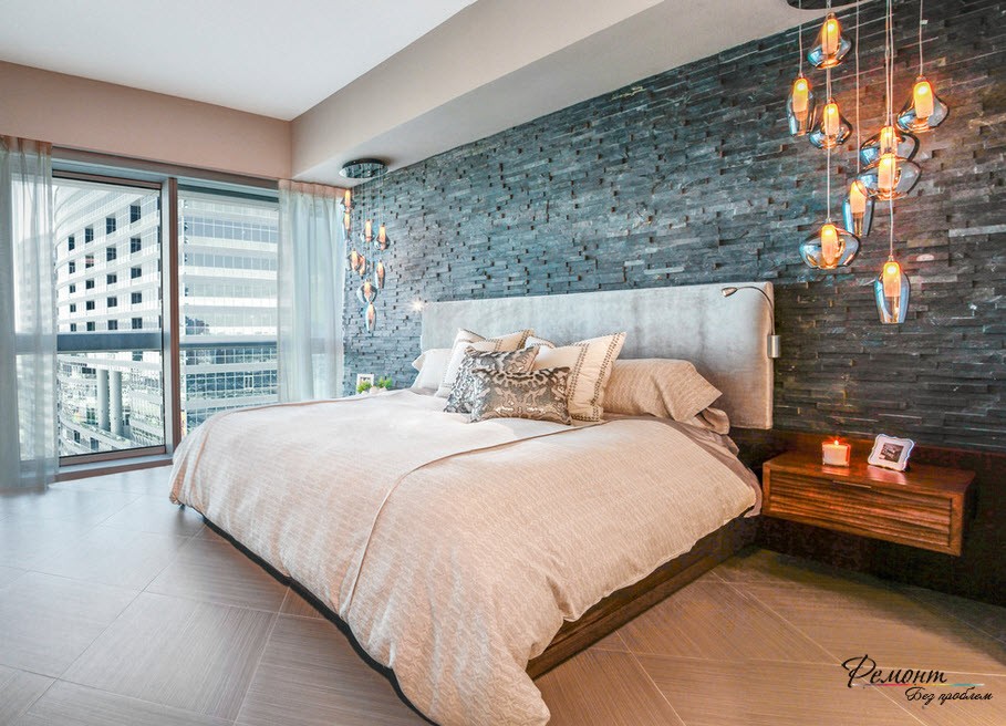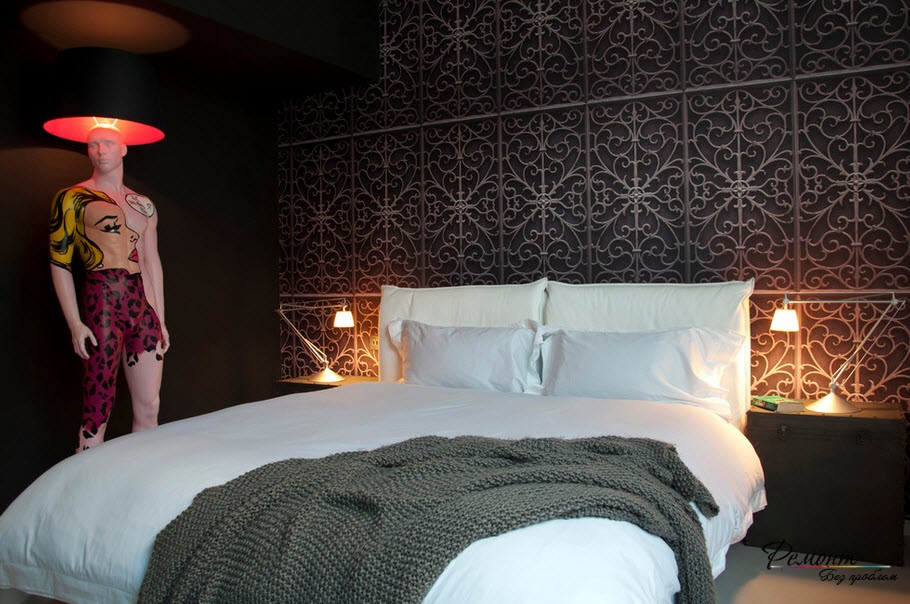 Не менее выигрышным вариантом будет использование декоративных панелей у изголовья кровати. Такие панели могут быть изготовлены из различных по плотности и текстуре материалов, а их цвет и рисунок подбирается индивидуально под дизайн комнаты.