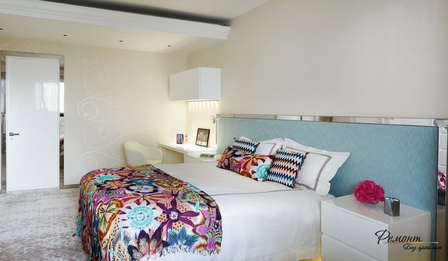 При желании выделить другие объекты в интерьере, можно выбирать небольшое изголовье, в тон стенам комнаты. Это позволит расставить акценты на предметах декора.