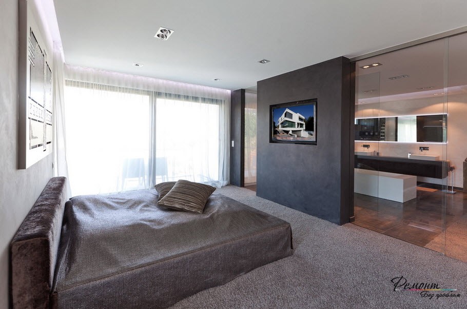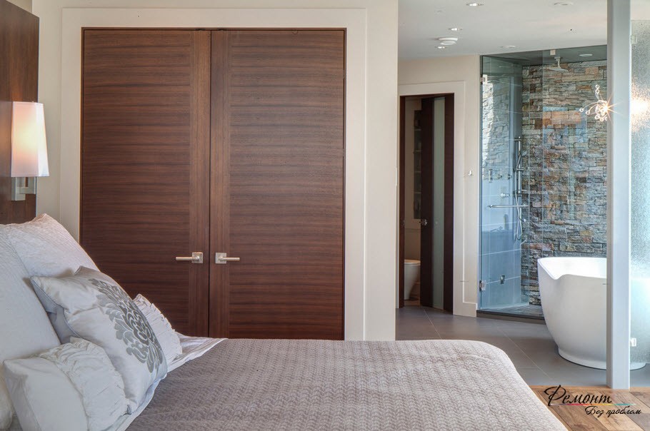 - ванная: нестандартное решение по объединению спальни и ванной комнаты имеет свои преимущества. Например, очень удобно сразу после душа переместиться в кровать, или наоборот, после сна приняться за водные процедуры.