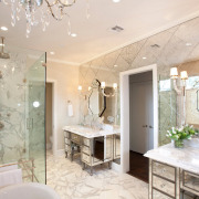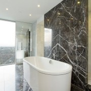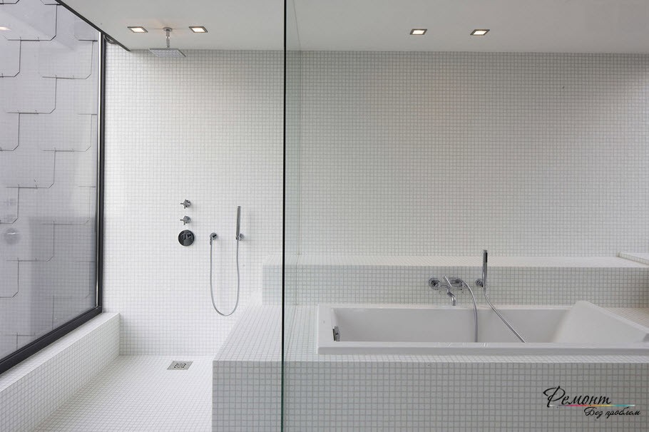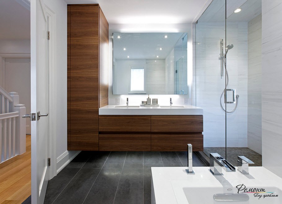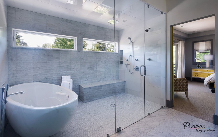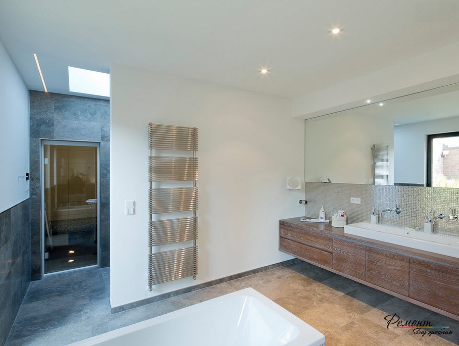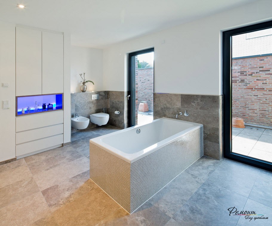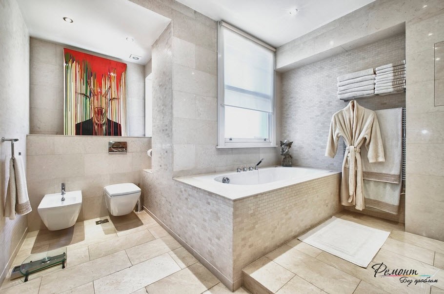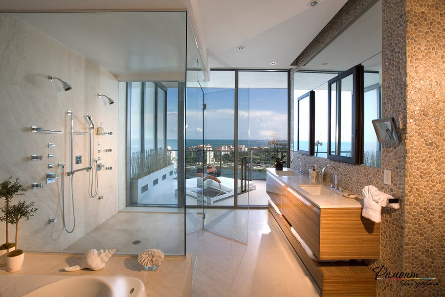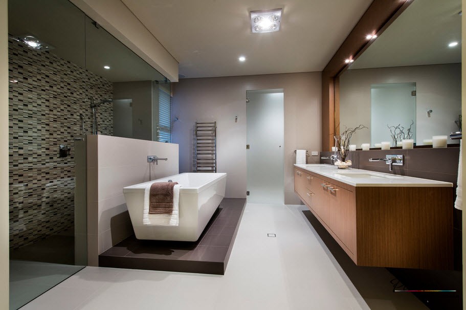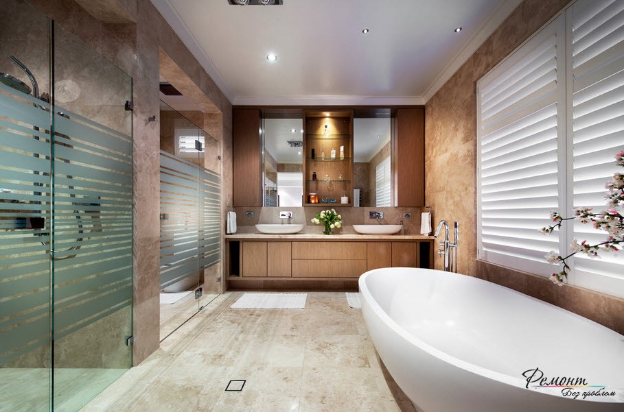 Престижная отделка требует в компанию участие красивой ванны. Согласно вашему желанию подход к ней могут обеспечить ступени. В другом варианте подиум допускается расширить в границах, и превратить купель в мини-бассейн. Душевую кабину не стоит включать в комплект и лучше смонтировать автономно. Оснащение дополнительным функционалом – гидромассажной системой и ароматерапией заменят SPA салон.