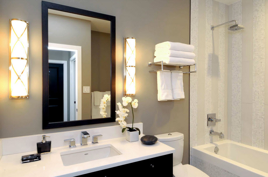 Освещение ванной – отдельный параграф. Его принято делать разноуровневым для регулирования с настроением и эмоциями. Помимо стандартного освещения используют зазеркальный свет, систему «звездного неба» или подсветки точечно размещают на полу.