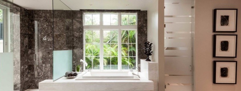 В этой ванной комнате с нетривиальным дизайном мрамор использован для отделки поверхностей ванны и раковин, которые расположились прямо возле панорамных окон с шикарным видом.