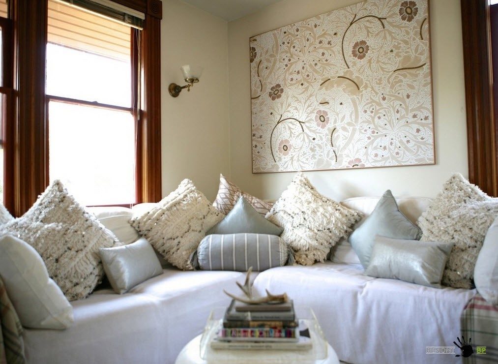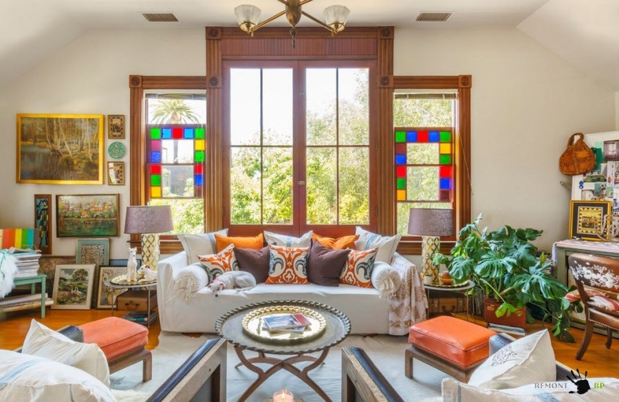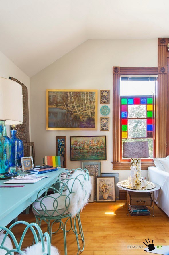Декоративные элементы, как калейдоскоп с разноцветными стекляшками разной формы и размеров наполняют комнату, но при этом сохраняют единый образ пространства для отдыха и общения, принятия гостей и занятий творчеством.
