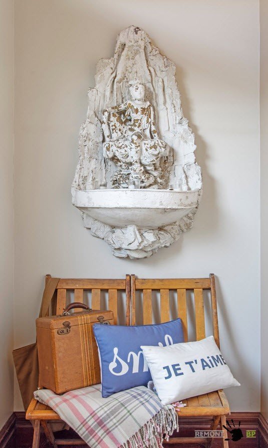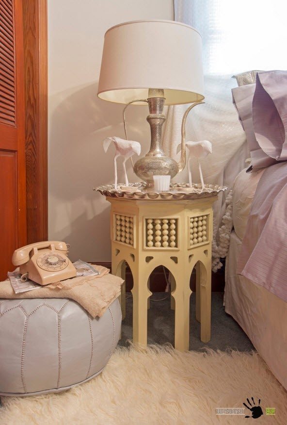 Изящный прикроватный столик, необычный настольный торшер и присутствие старинного дискового телефона – все в этой эклектичной спальне работает на создание самобытного, но при этом внешне привлекательного интерьера. Несмотря на множество декоративных деталей и нетривиальных способов украшения комнаты, вся спальня смотрится светлой, ее палитра в пастельных тонах способствует расслаблению, спокойному отдыху и крепкому сну.