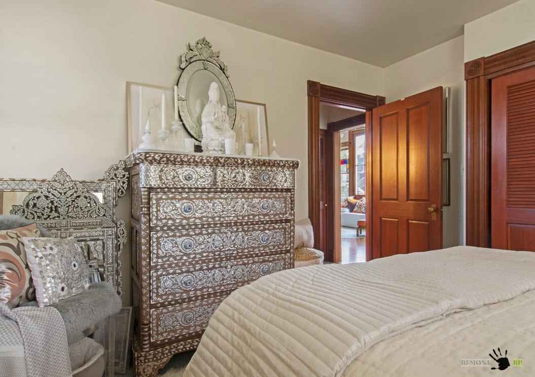 Заглянем и в личные апартаменты – спальню. Здесь, на фоне пастельных тонов отделки выставлены на обозрение, как уникальные предметы мебели, так и эксклюзивные элементы декора. Необычный комод с оригинальным декором стал центром притяжения всех взглядов, несмотря на то, что в спальне таким центральным фокусным предметом обычно является кровать.