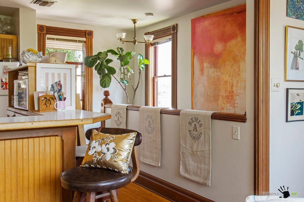 Несмотря на кажущуюся разобщенность интерьеров, в разных функциональных сегментах домовладения присутствуют общие конструктивные решения, цветовая палитра и способы отделки, объединяющие различные идеи и стили под общей концепцией обустройства жилища. Белоснежная отделка, использование дерева для оформления оконных и дверных проемов, напольных плинтусов и изготовления элементов меблировки, применение осветительных приборов схожих моделей, присутствие живых растений – вес эти дизайнерские решения помогают объединить комнаты жилища в одну яркую, разномастную, но такую уникальную обстановку.