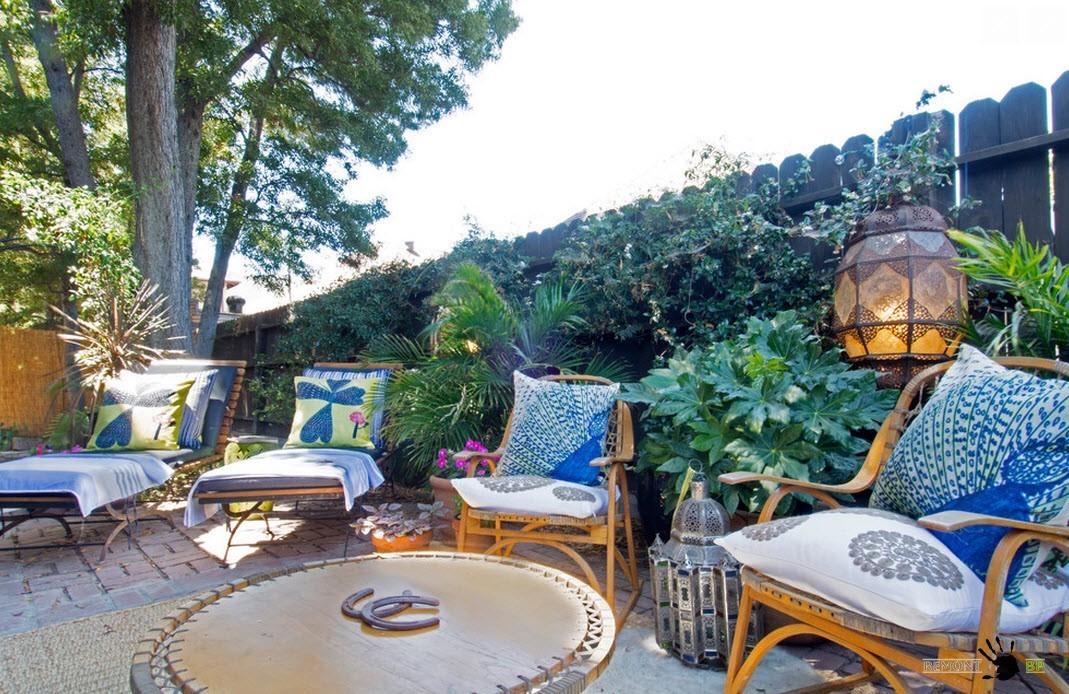 Необычные светильники в восточном стиле прекрасно гармонируют и с разнообразной растительностью, растущей как в открытом грунте, так и во всевозможных горшках и кадках. Пестрый принт ярких подушек добавляет красок живописному месту для отдыха.