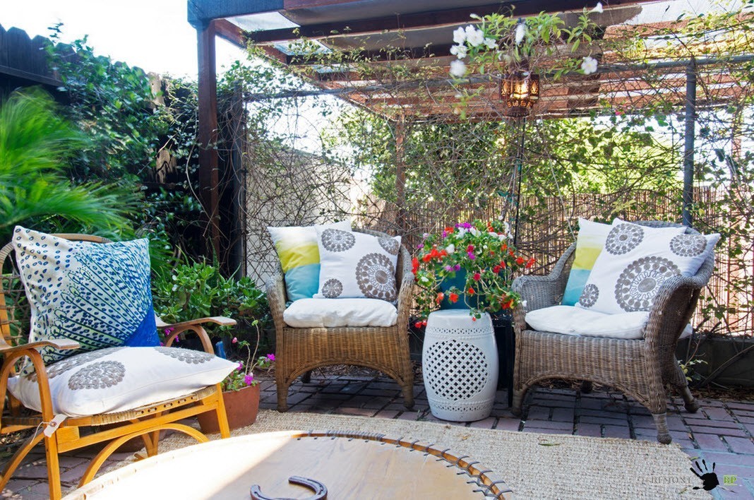 Для стиля эклектика нет ничего странного в использовании в одной композиции мебели из различных материалов. Например, плетеные кресла из ротанга прекрасно сочетаются с деревянной садовой мебелью, керамическими или глиняными подставками и декором. С помощью центрального элемента – столика и уличного напольного покрытия, все предметы мебели и декора объединены в один функциональный сектор, сбалансированный растительностью и осветительными приборами, выполненными в одном стиле.