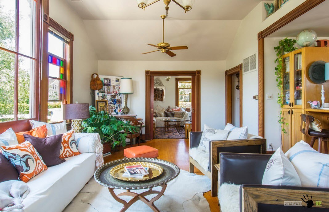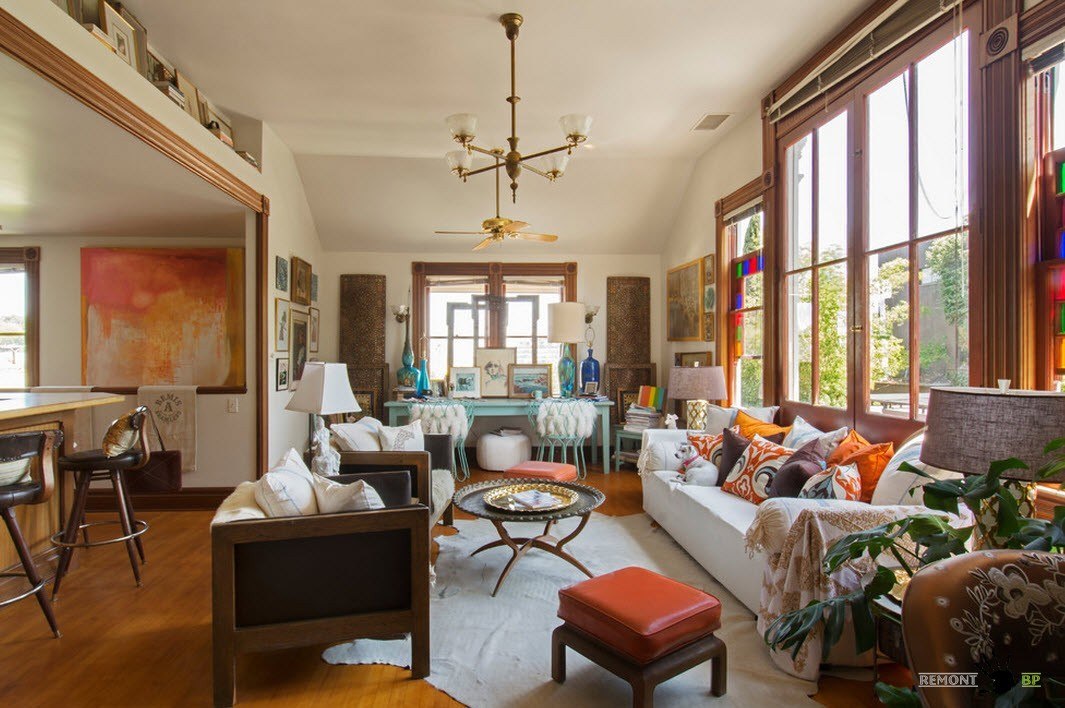 Еще одна небольшая зона отдыха находится в соседней от большой гостиной комнате. Здесь мы видим повторение в способе отделки помещения, оформления окон напольного покрытия, объединяющего общей концепцией все помещения эклектичного дома. Но при этом у мини-гостиной есть свой неповторимый шарм. Который как мозаика складывается из разнообразных элементов с различной стилистической идеей в одно общее, гармоничное полотно с красивым рисунком.