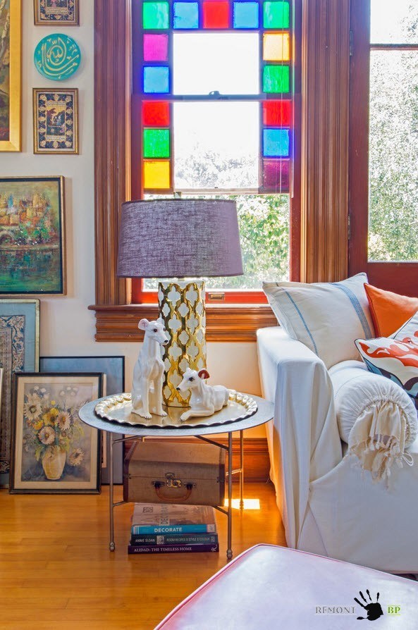 Начнем эксцентричную экскурсию с самого просторного помещения в доме – гостиной, соединенной с кухней свободной планировкой. Первое, что бросается в глаза в этой яркой комнате – оригинальное оформление оконных проемов. Не только яркие элементы витражей приковывают взгляды, но и нетривиальный подход к облицовке приоконного пространства. «Выдержать» подобную яркость, а также множество настенного декора, под силу только белоснежной, гладкой отделке стен помещения, не отвлекающей на себя внимание и служащей отличным, нейтральным фоном.