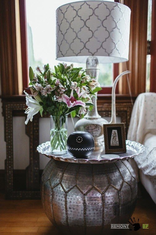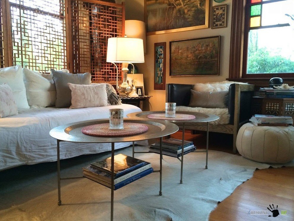 Только на первый взгляд может показаться, что все декоративные элементы, столики, подставки и осветительные приборы выполнены с использованием разных материалов, конструктивных и стилистических идей. Общая канва исполнения декоративных элементов, текстиля во всех помещениях перекликается с темой соединения европейских и восточных идей под одной крышей эклектично оформленного дома.