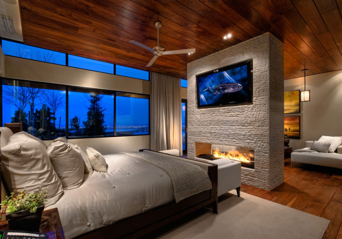 Электрический камин – это лучшее предложение для спальной комнаты, ведь по сравнению с оригинальными моделями, подобный экземпляр не нуждается в обустройстве дымоходной системы и сложном уходе. Для обустройства спальни приветствуются встроенные, напольные и настенные модели со стандартным либо дистанционным управлением.