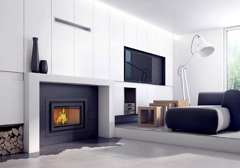 - пристенный, размещается вдоль стеновой поверхности и наиболее точно имитирует оригинальный очаг;