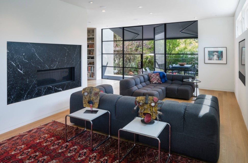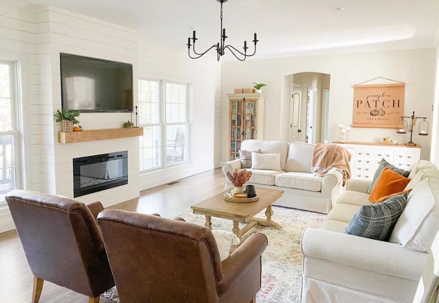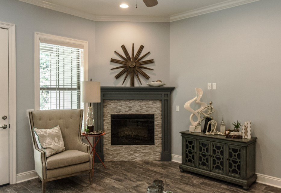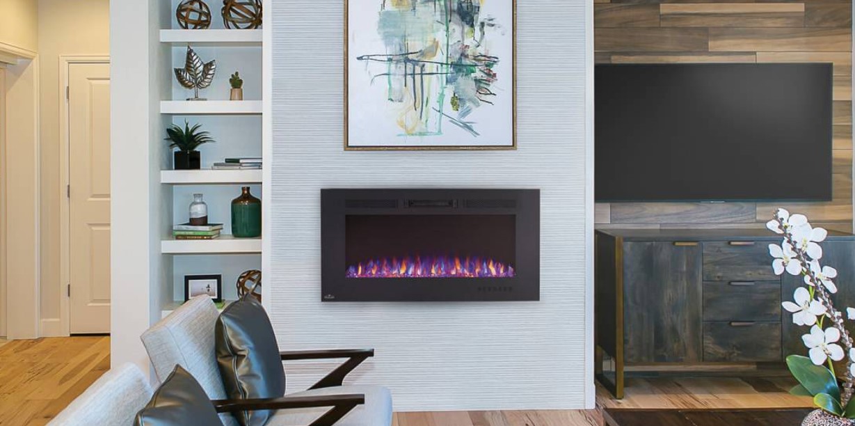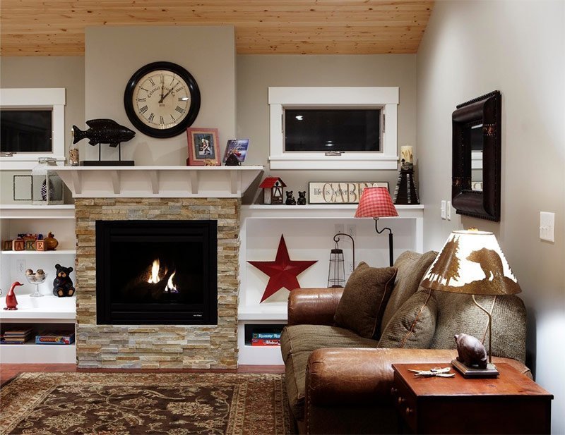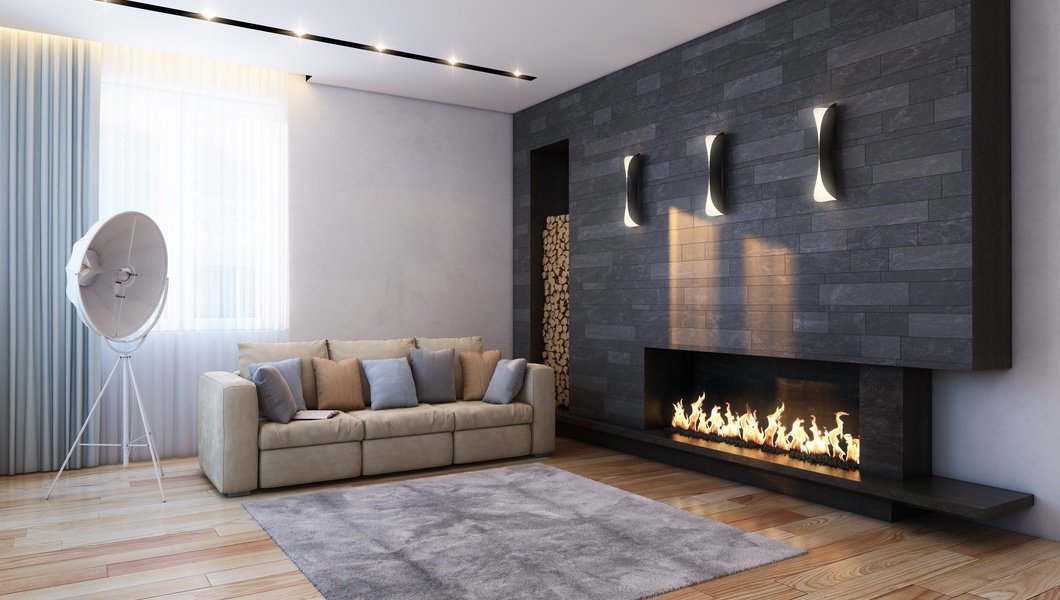 Размещение электрического камина над диваном позволит создать в зоне отдыха уютную атмосферу. Для создания максимально гостеприимной атмосферы и красивого фокуса можно заменить камином телевизор.