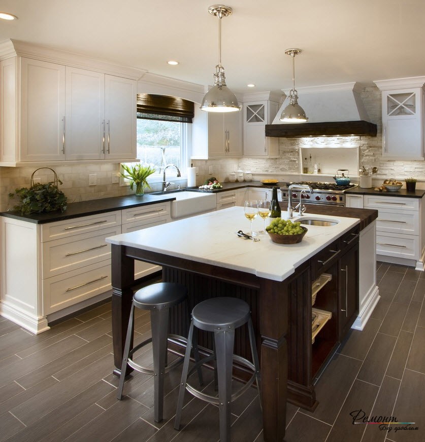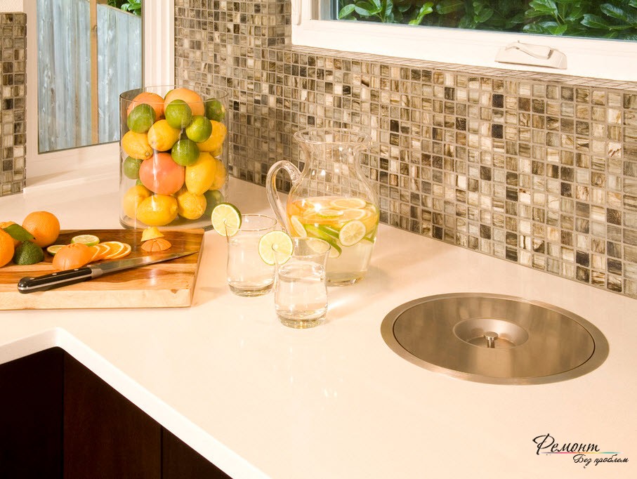 Столешница должна выполняться из материалов, обеспечивающих ей необходимую влагостойкость, простую очистку и устойчивость к механическим повреждениям. Также материал должен гармонично вписать такую поверхность в общий интерьер. Среди подходящих материалов можно отметить натуральное дерево, ламинированный ДСП, искусственный или натуральный камень, керамическая плитка и многое другое. Главное – гармоничное сочетание элемента со стилем и цветовым решением кухни.