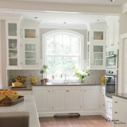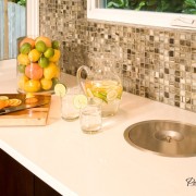 Стеклянная плитка для создания фартука тоже имеет ряд преимуществ. Разнообразие текстур и видов позволяет создать необходимый антураж. Такая плитка может быть гладкой, глянцевой, рельефной, прозрачной, однотонной или с узором. Этот материал выдерживает температурные нагрузки и может прослужить долгие годы, не потеряв своего внешнего вида. Такая плитка боится лишь механических повреждений.
