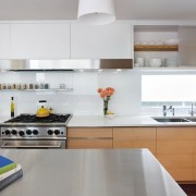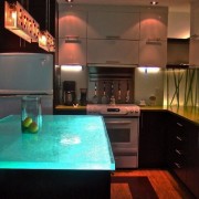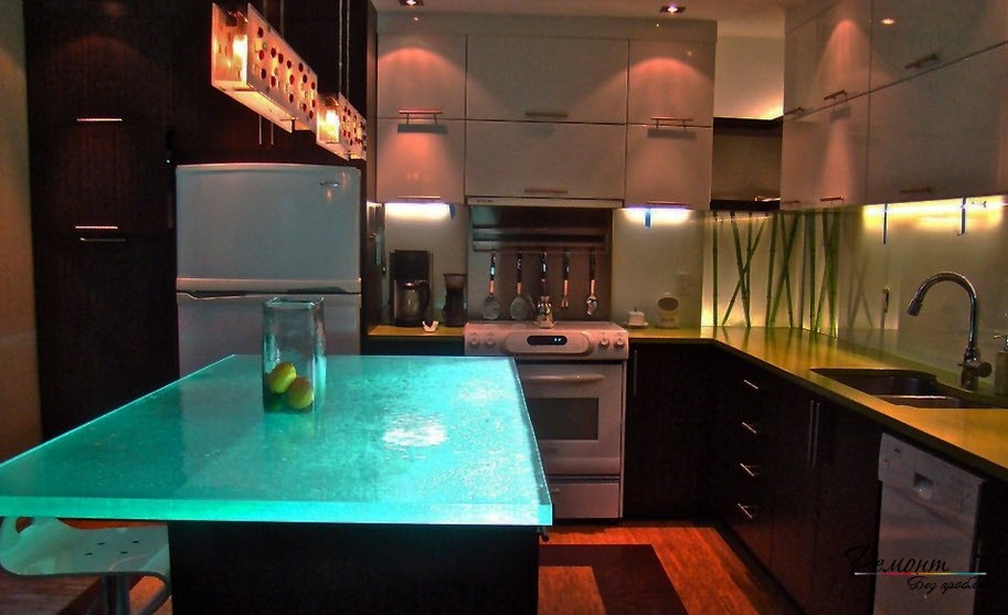 Швы между деталями из стекла также могут засоряться остатками пищи и пылью. Использование монолитного каленого стекла поможет решить такую проблему. Под стекло можно поместить любое изображение. Или сделать из него скинали, нанеся изображение прямо на поверхность стеклянного фартука. Недостатком такого изделия может стать его высокая стоимость.