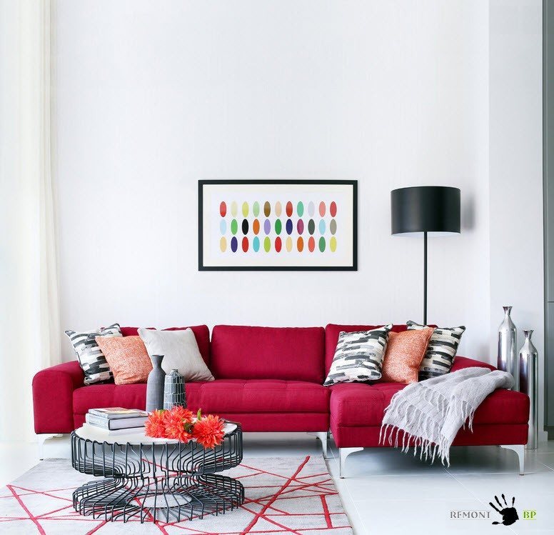 В современных квартирах улучшенной планировки все чаще используется открытая планировка, когда различные по функционалу сегменты жилища плавно перетекают одно в другое, когда между гостиной и столовой, кухней, нет перегородок и дверей, даже ширм в виде стеллажей или иных систем хранения. Именно так обустроена квартира, в которую мы сейчас заглянем, чтобы подробнее рассмотреть интерьер. Перед нами гостиная – просторное помещение почти квадратной формы условно можно разделить на две зоны – отдыха и TV-зона с уголком для чтения. Зону отдыха организовал угловой диван насыщенного малинового цвета, оригинального дизайна журнальный столик и черный напольный торшер, используемый для локальной подсветки. Для такой яркой меблировки белоснежная отделка стен стала идеальным фоном.