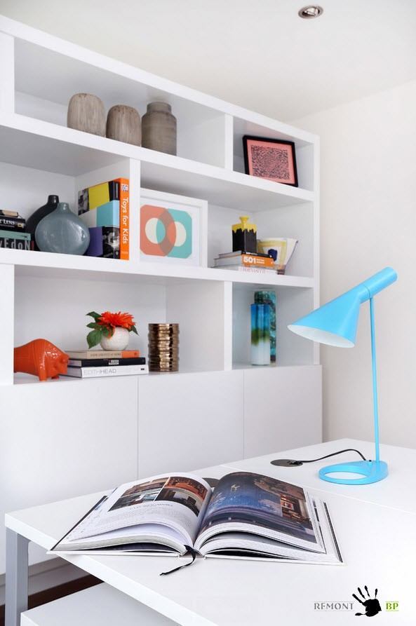 Рабочая зона мини-кабинета представлена белоснежной меблировкой – системой хранения с комбинированием открытых полок и закрытых шкафчиков и простым письменным столом с яркой настольной лампой.